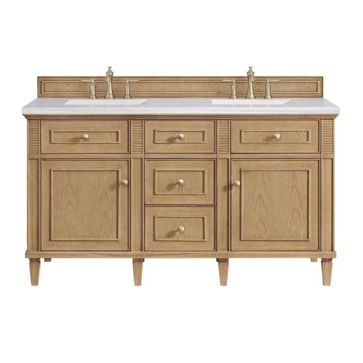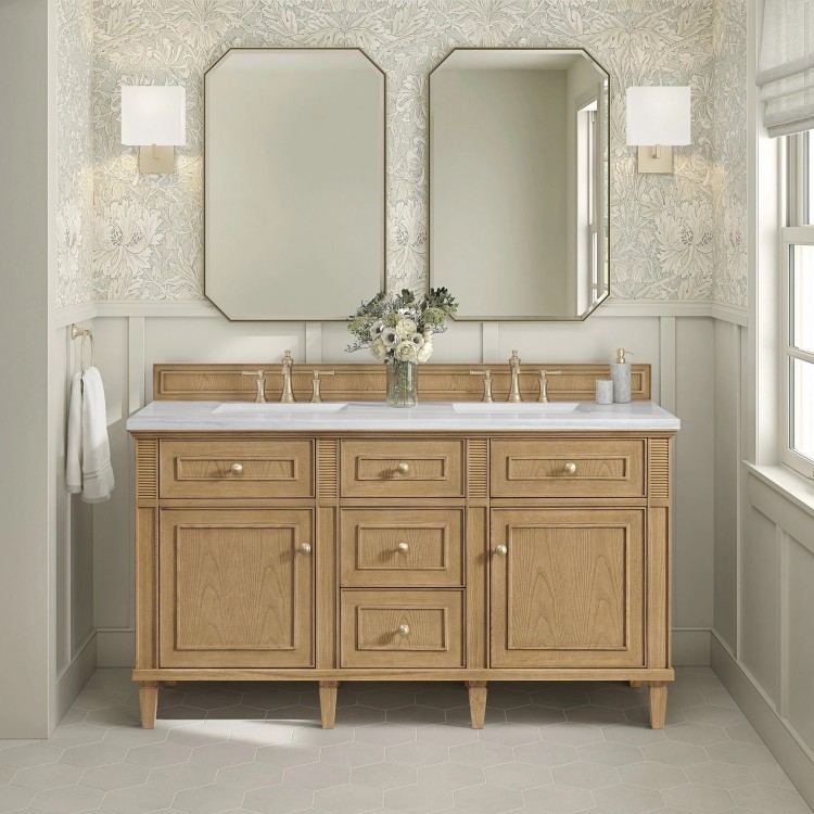 The 60" Lorelai Double Vanity celebrates timeless form and exquisite finish details, combined with practical function. The Light Natural Oak finish is accented by reeded details, and clean, raised picture frame molding. Coin-edge knobs in Champagne Brass provide the perfect accent. This two-door cabinet opens to spacious interior with shelves and convenient USB/Electric power outlets. 3 traditional drawers and 2 tip-outs offer additional storage space. Choose one of our 3 cm tops with undermount, rectangular sinks to perfectly complete this masterpiece.