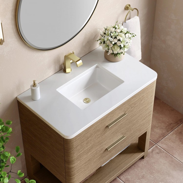 The Lucian 36” single vanity is a visual delight, boasting a rich Pebble Oak finish that adds warmth and character to your space. Complemented by Champagne Brass hardware, the ribbed detailing is meticulously crafted. Enjoy ample storage with two drawers and a lower exposed shelf that provides versatility to your storage solutions. Complete the look with one of our 3 cm tops and undermount porcelain sink, for a seamless integration of modern design and functionality.