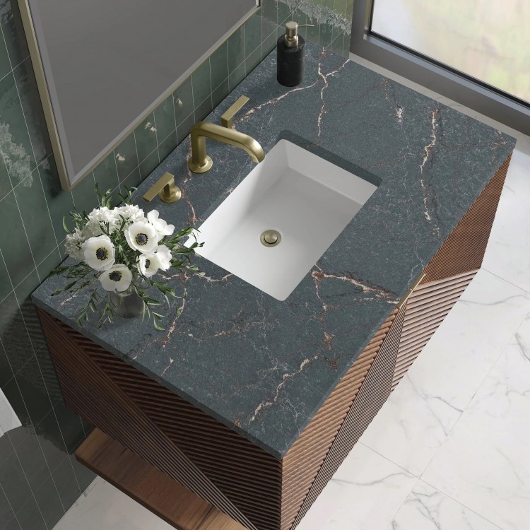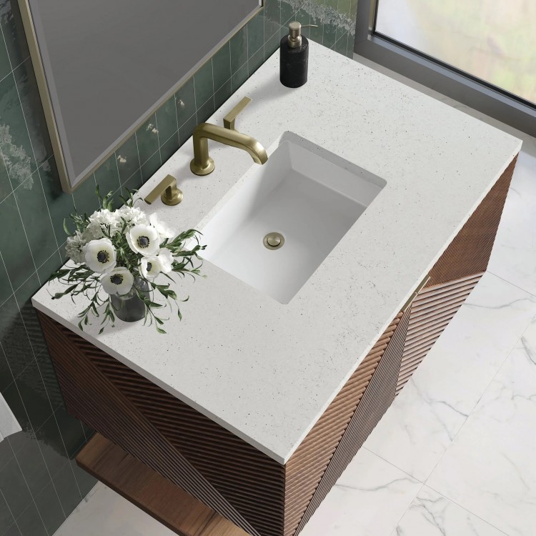 The 36" Marcello vanity is a statement in luxury and style for any bathroom. Featuring meticulous ribbed panels in a warm Chestnut stain, these re-sawn Acacia veneers boast an elegantly symmetrical pattern both on its front and sides. The pattern reveals generous sets of doors that open to internal drawers and shelving, while a floating shelf provides an additional layer of functionality and balance. Add modern drama and practical sensibility to your bathroom with this beautiful vanity.