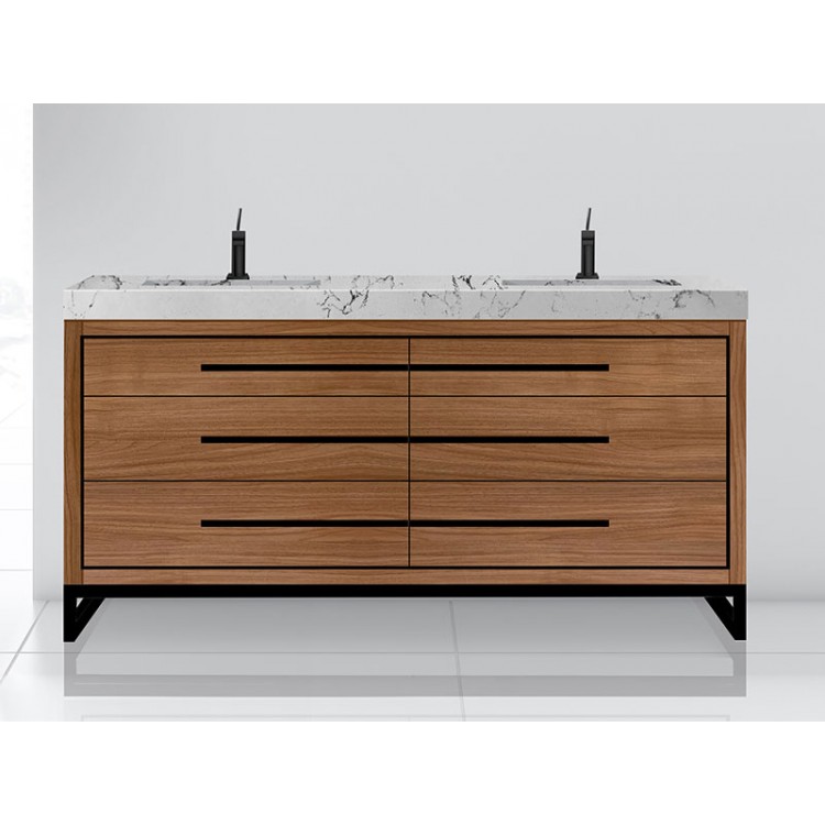 Sleek and yet substantial, the new Estate Collection vanity adds true glamour to your bathroom with stylish metal inlay decor and long sleek handles available in a choice of lustrous satin brass, matte black, polished chrome, polished nickel and brushed nickel. Your choice of a matching metal wrap-around base or legs completes the sophisticated custom furniture look. Choose from four polyurethane-protected colors including White, or new arrivals Natural Walnut, Natural Oak, Brandy woodgrain, Studio Grey or Sapphire finishes, and pair it with a variety of countertop/basin options in X-Stone™ Solid Surface, Quartzstone, glass or ceramic to create your own custom look. With the advantage of Madeli’s extensive storage options, soft-closing European hardware, and other standard luxury features, your vanity will be the star of your bathroom.